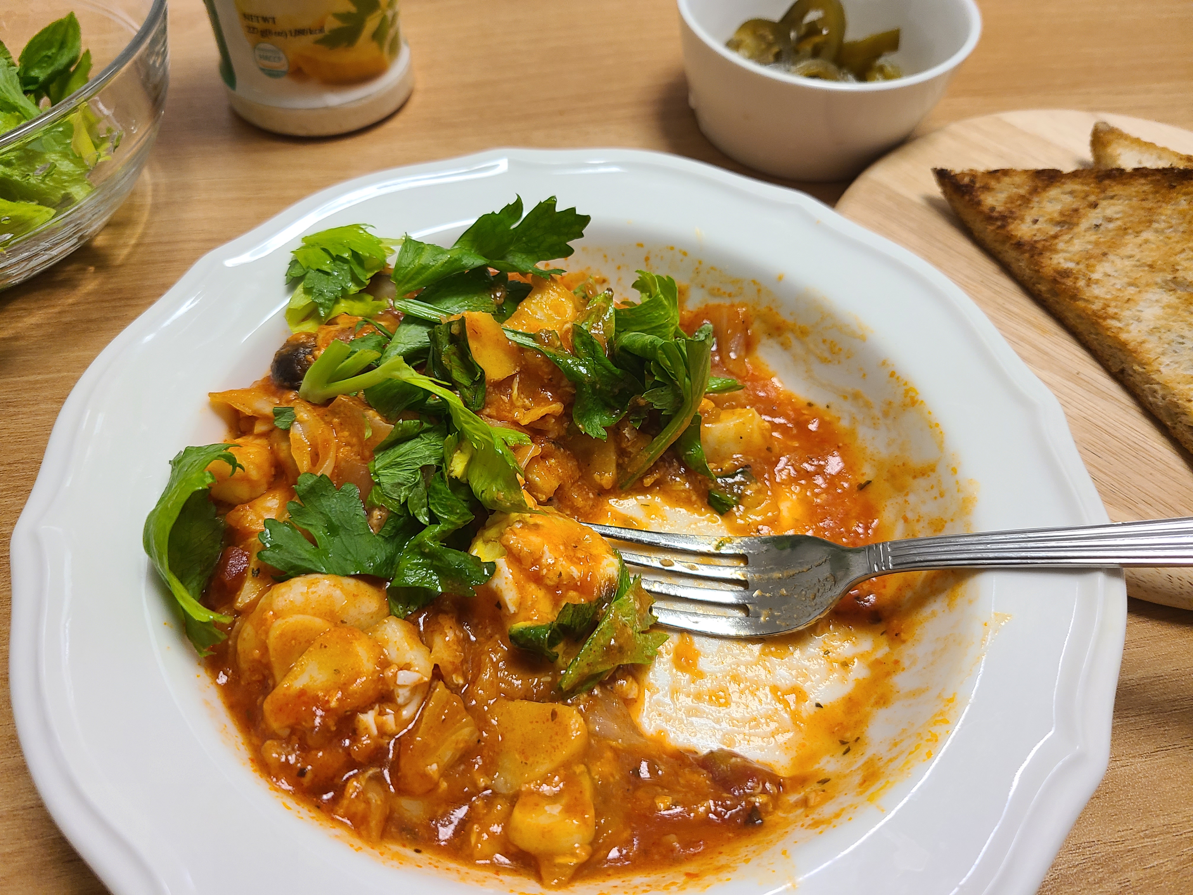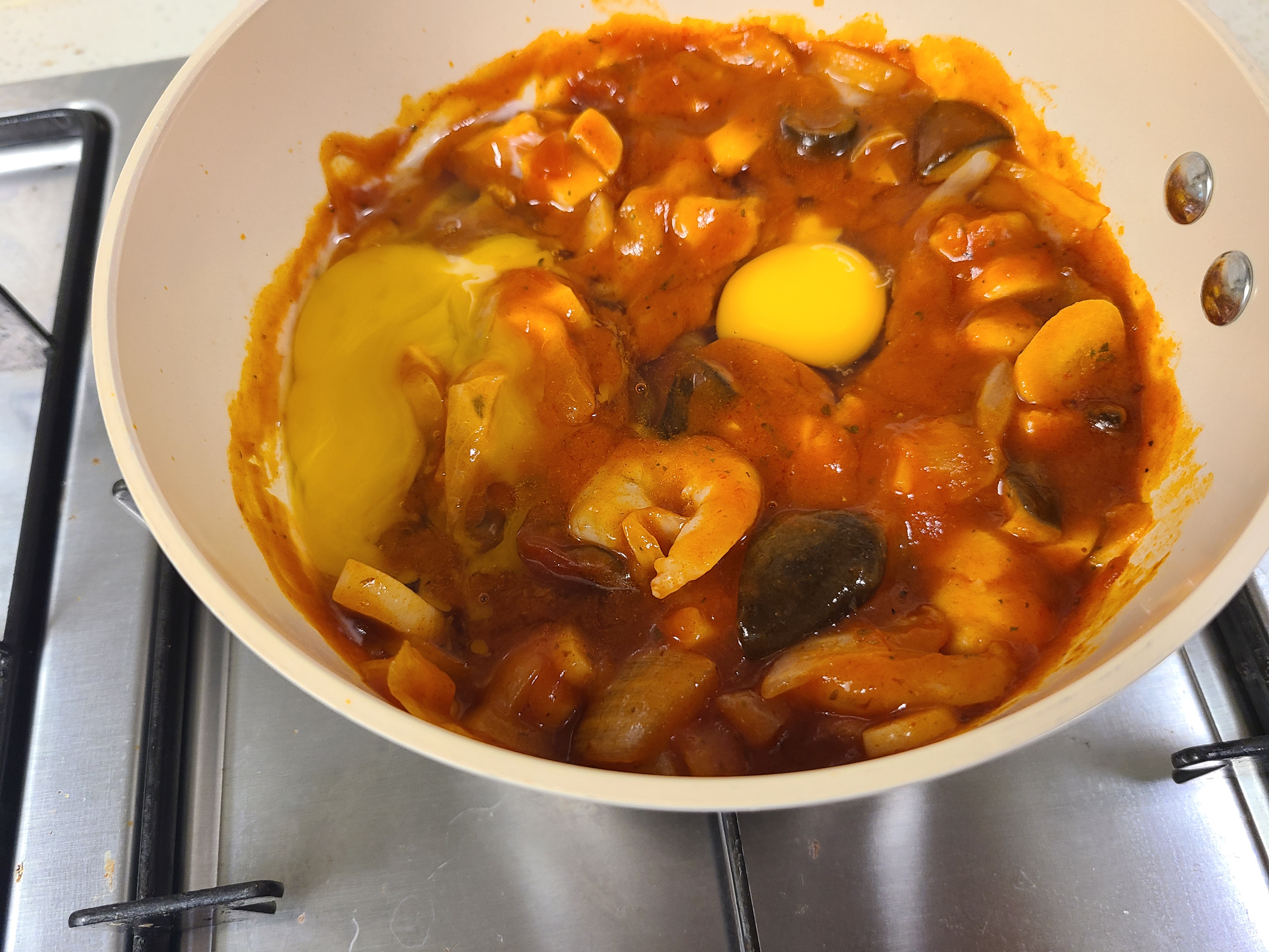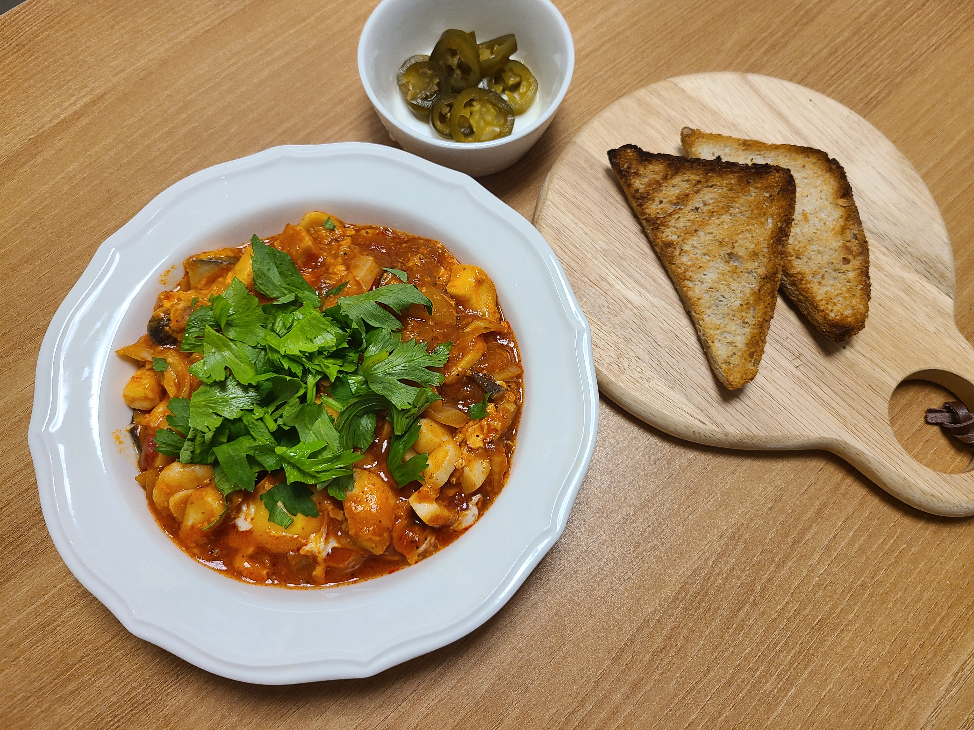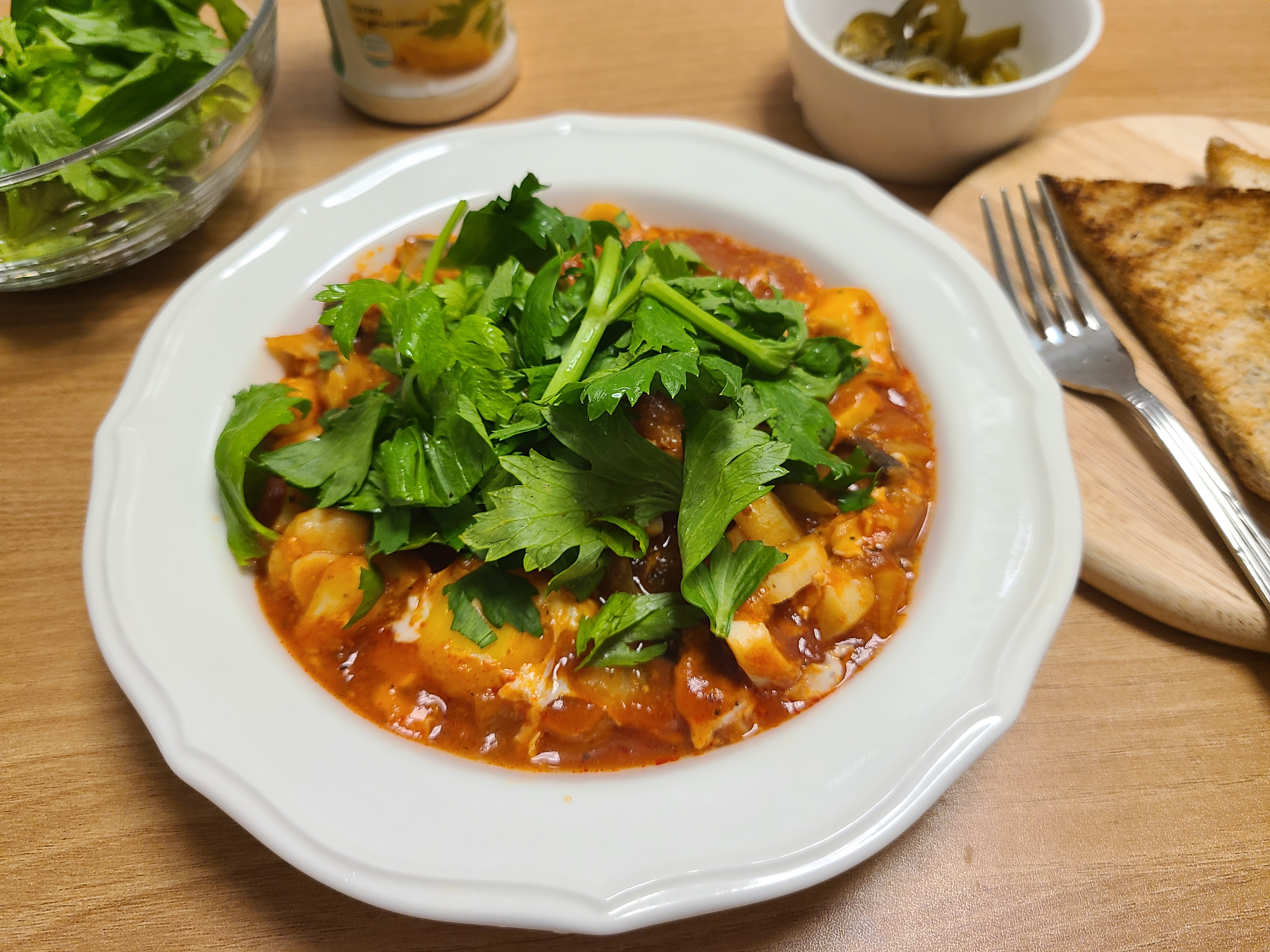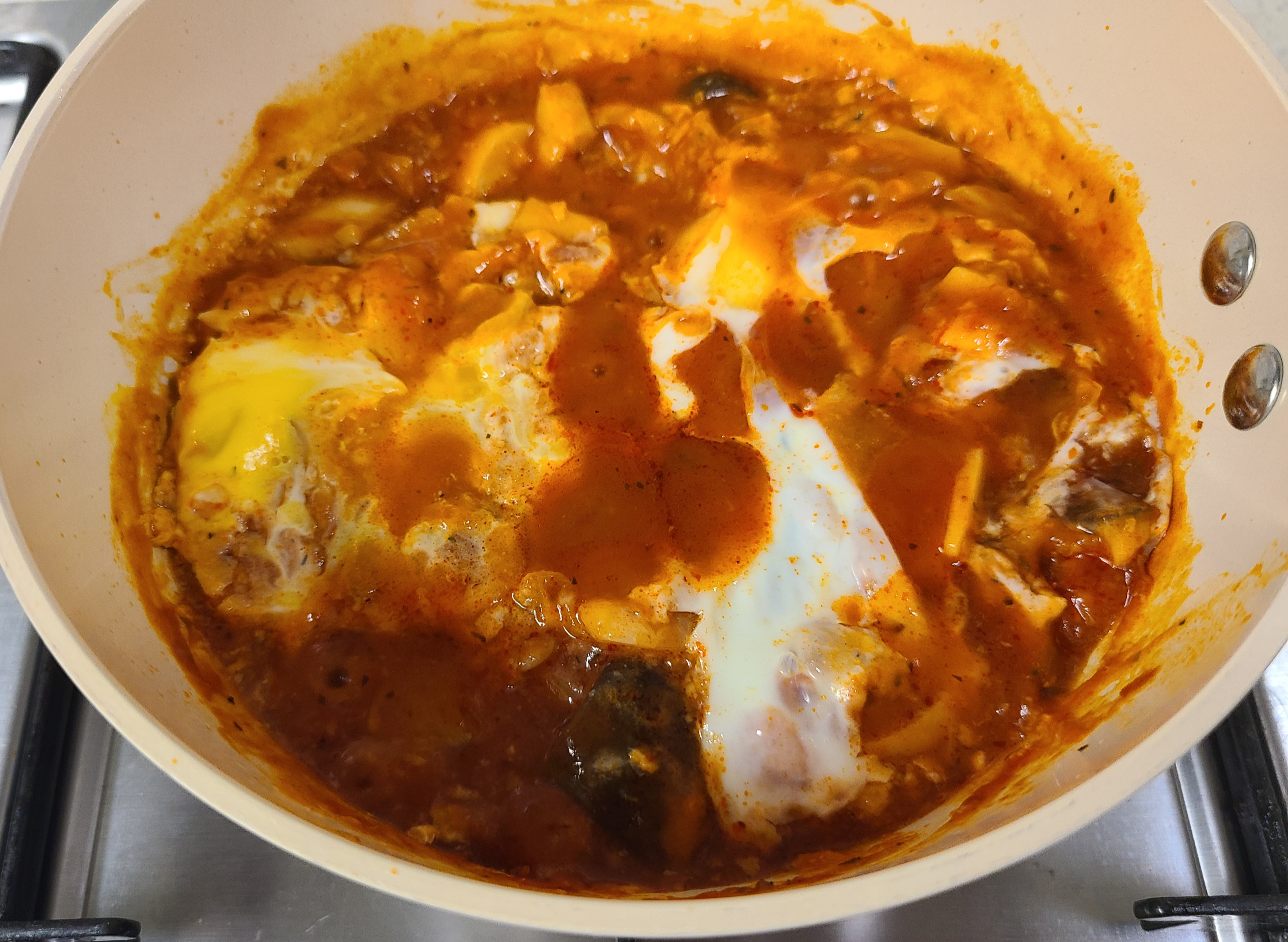 완성된 상태가 너무 못난이 샥슈카가 되었습니다. 원래 달걀 노른자가 예쁘게 자리 잡아야 하는 샥슈카인데 말이죠.