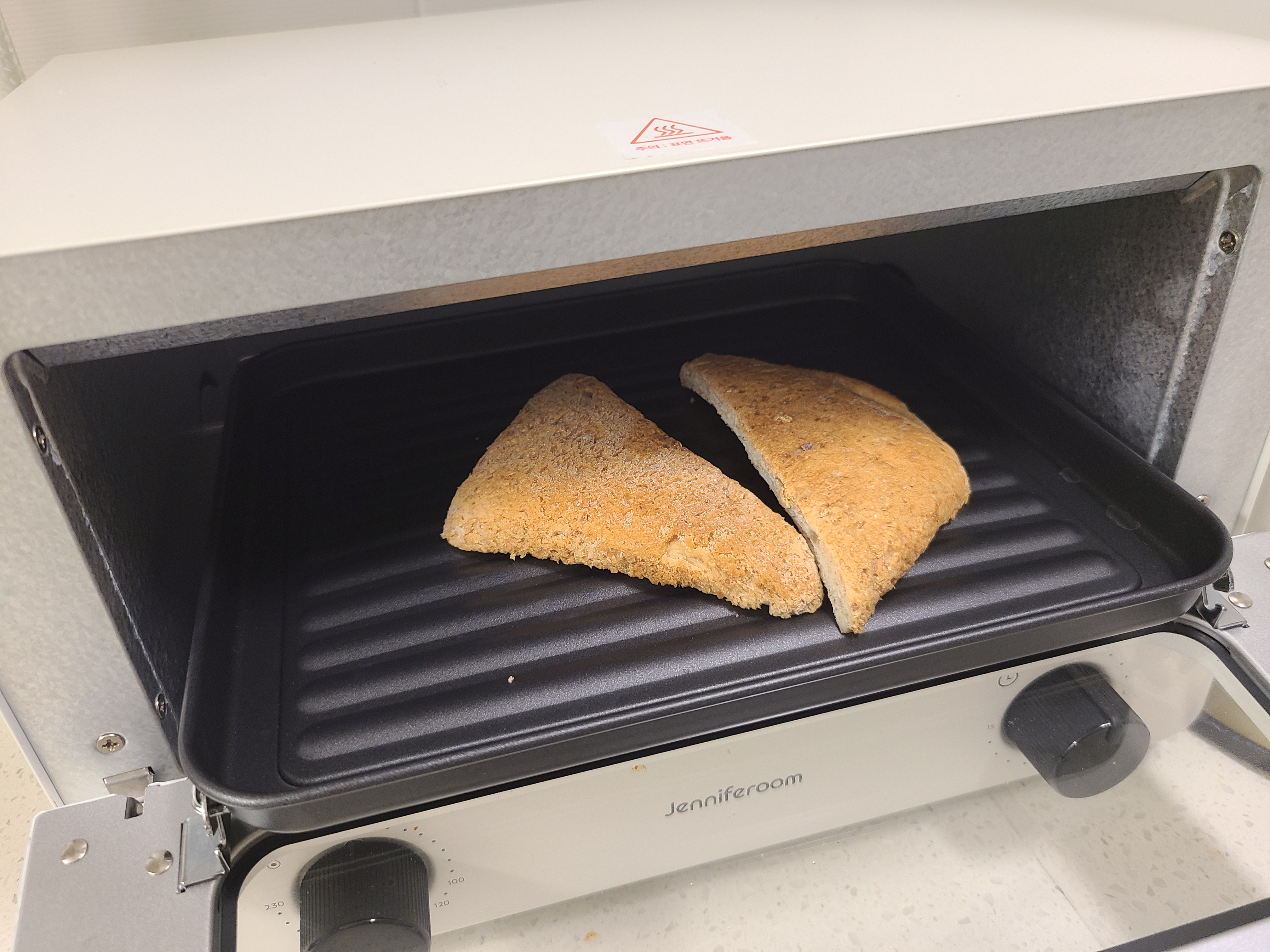 달걀이 익는 동안에 같이 먹을 식빵도 오븐에 잠깐 구워줍니다. 오븐 말고 에어프라이어를 사용해도 좋아요. 빵이 싫으면 꼭 같이 안 먹어도 좋지만 샥슈카에 빵 찍어먹으면 천국의 맛이랍니다.