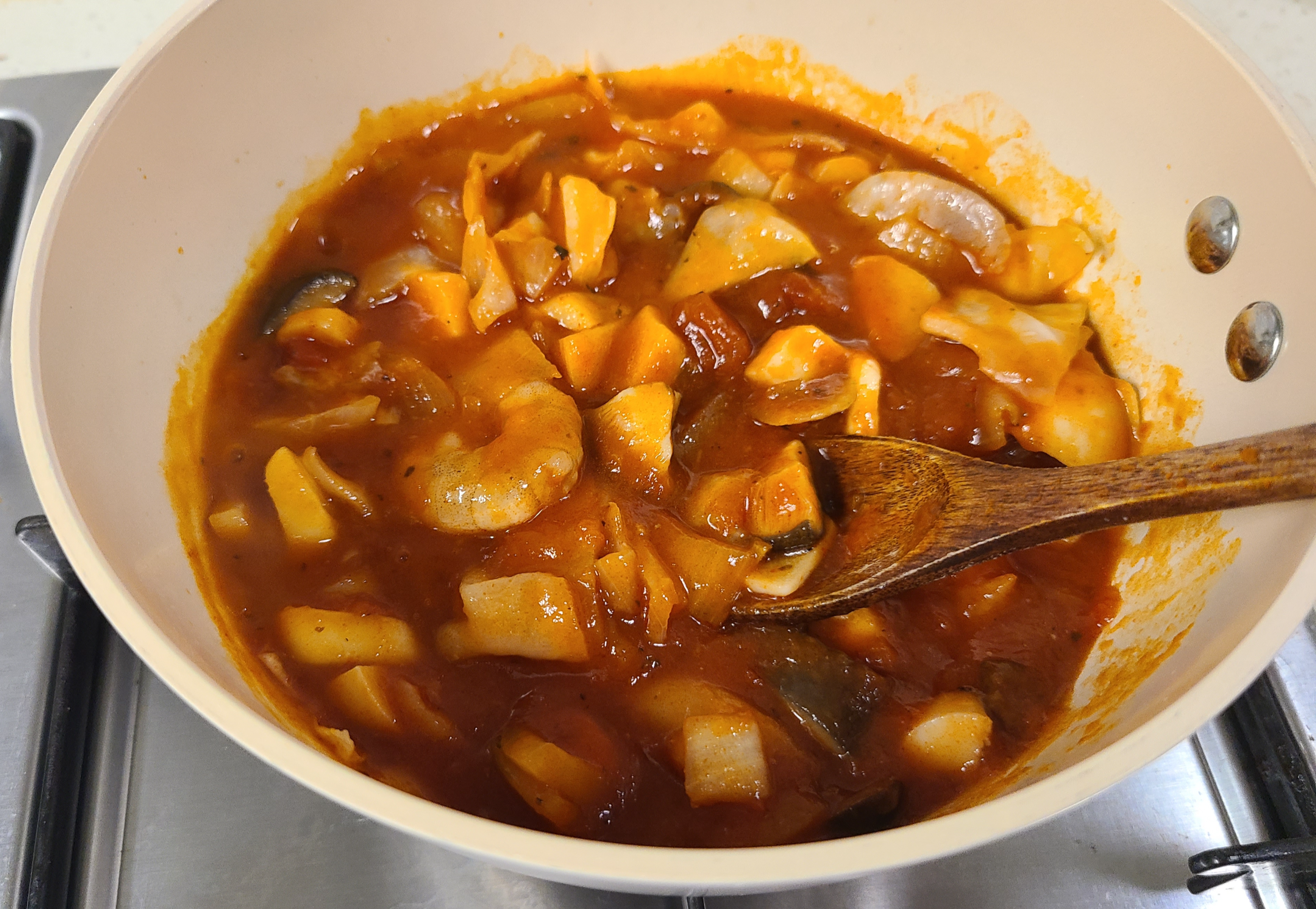 아래에는 달걀과 야채들 그리고 새우가 잘 숨어 있어요. 각종 해산물들 오징어나 관자, 조개들을 넣어도 맛이 있습니다.